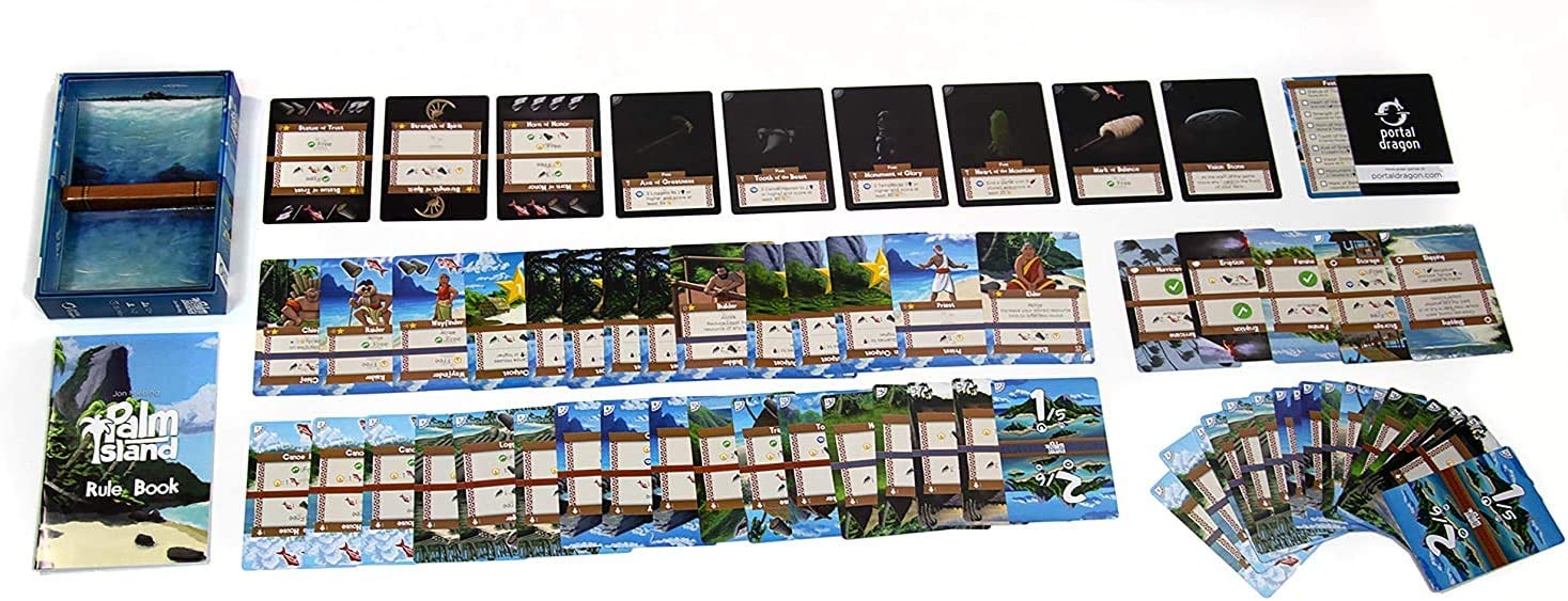 Using a deck-transforming mechanic, a player uses just 17 cards over 8 rounds to shape their island and overcome its unique challenges. Store resources to pay for upgrades and upgrade buildings to access new abilities. Each decision you make will alter your village from round to round. Complete your objectives within 8 rounds and calculate your score. Palm Island is a solo game with multiplayer variants. The game comes with enough cards for 2 players but multiple games can be combined to support even more.